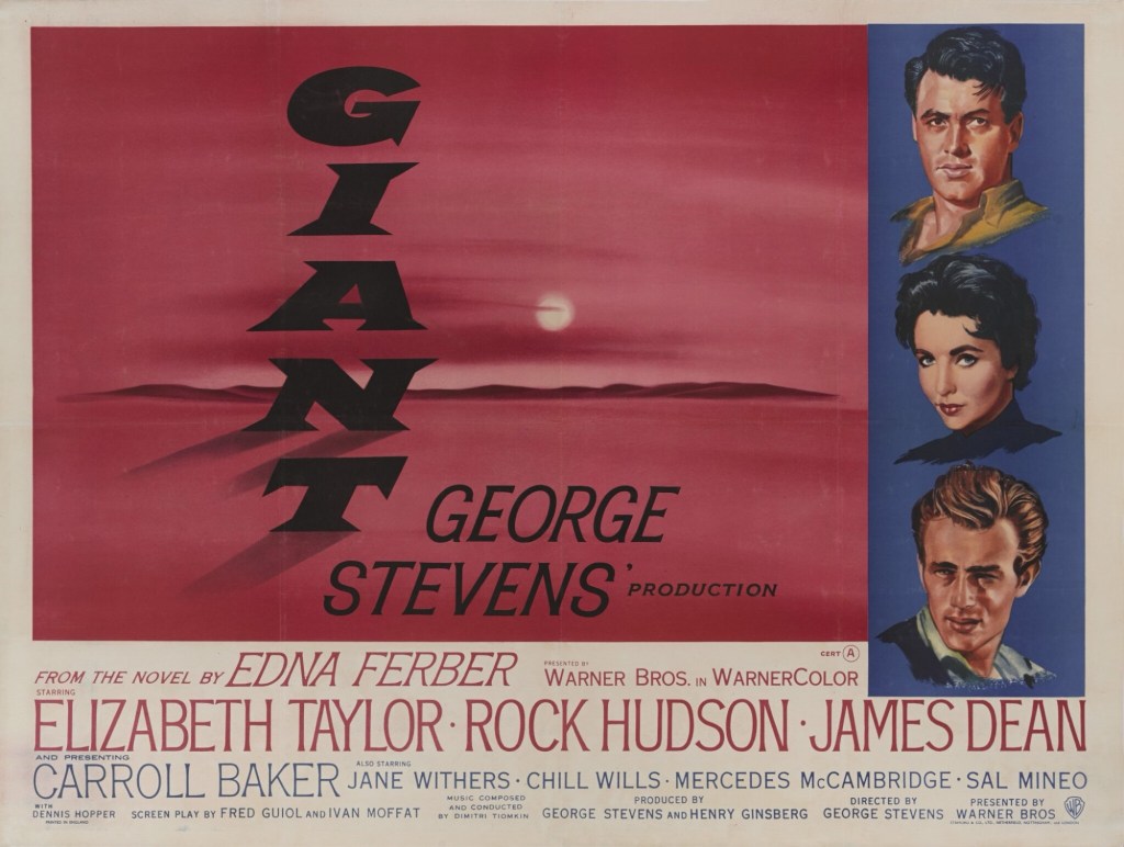Did you know that James Dean was in three movies? This is one of them. It lives up to its title, clocking over three hours. In the style of Cavalcade and Cimarron, it’s a sweeping epic about the state of Texas and its Texan folk. James Dean is so compelling that he distracts from Elizabeth Taylor, and if you’ve ever gotten an eyeful of Elizabeth, you’ll know that’s not an easy task. Elizabeth and Rock Hudson raise a pile of Texan children and struggle to navigate racial disparity as well as their inbred differences – a born Texan and a married-into-one.